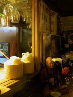 Old Weang Ping is overgrown with ivy and tropical plastic flowers. Wood birds suspend from the ceiling, mismatched string lights adorn the walls, and a cascading alter to an orange-cloaked meditation guru greets you at the doorway. But here my normal gag reaction to clutter doesn’t kick in. In fact, the palm thatch booths, the tiny window that peaks into the kitchen, the easy, beachside paced service and yes, the chachki exude the feeling that somewhere along I-580 E we exited and ended up at a Phuket hideaway.