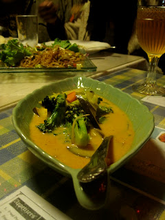 The menu is a black and white photocopy underneath the glass top of our table. Half of it is handwritten, the subheads are in old English (pimp cups, pimp font!), and the prices are all under $7.25. Specials up on the chalkboard range a little more. Aside from your standard appetizers and sides like satay and papaya salad, you’ll also find a barbarian soup, seafood cucumber salad, three different kind of cakes, and a fruit drink (it’s not a juice, it’s a fruit drink). But for the most part the menu works as so: pick a protein ranging from duck to catfish and pick a sauce (curry, peanut, sweet basil, etc.) Or for the vegetarians, pick three veggies and pick a sauce. If there’s a chili pepper next to the sauce believe it means you’ll get a little sweat on the brow.