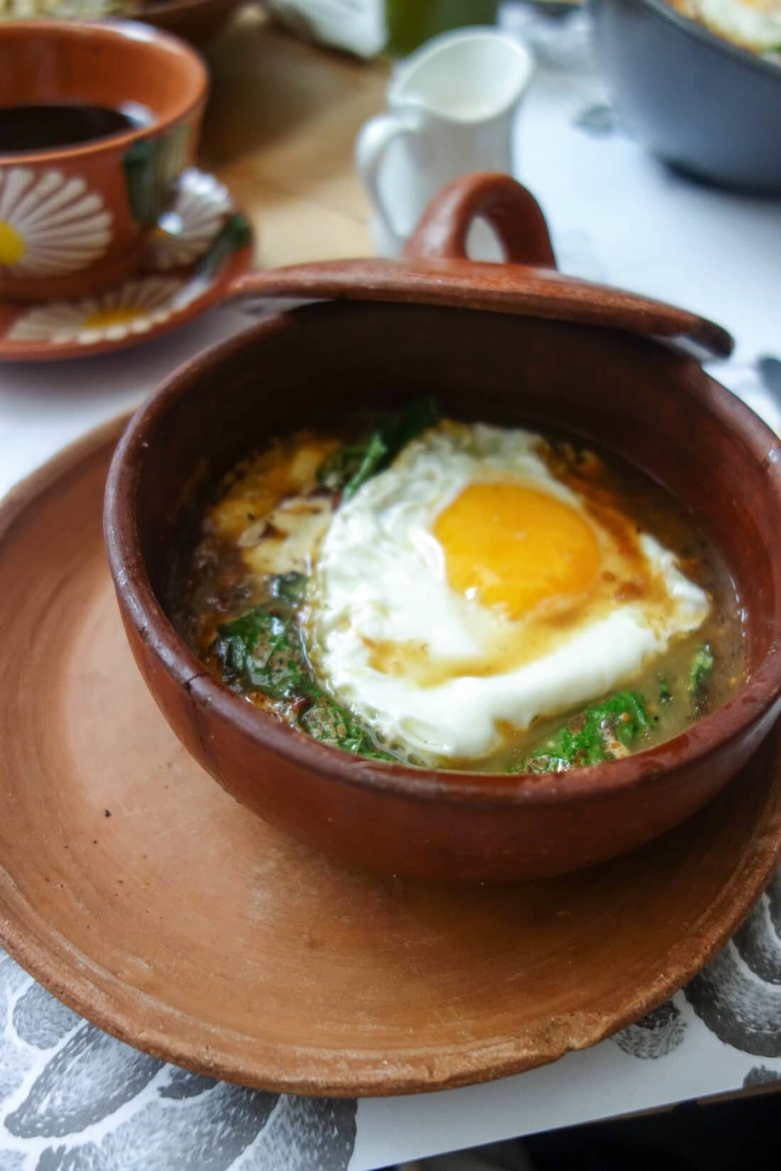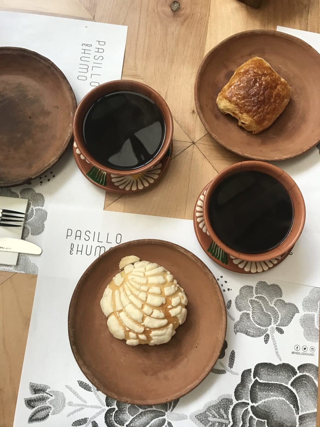 Tucked in the same building as Mezcaleria La Penca is a small café with specialty coffee from Mexico. The staff is super friendly, gladly giving me a whiff of the espresso grain of the day from Nayarit. A small roaster sits in the corner where they roast on off hours, and you can grab 200 gram bags of coffee starting at $96 pesos (about $5 USD) from Nayarit, Oaxaca and Chiapas. The space feels like a cool refuge on a sunny day, with high ceilings, cool concrete walls and light shining in from the glass doors. Black and white tiles border counters and benches, and pops of color come from ceramic artwork and murals that decorate the hallway. There’s comfortable seating in the narrow café or across the hallway in a larger room. You can also order pastries or breakfast from the neighboring restaurant down the hall.